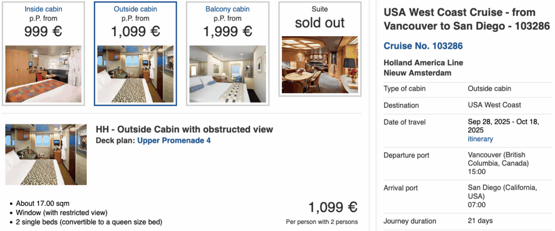 At the end of September 2025, the Nieuw Amsterdam of the Holland America Line will embark on an interesting cruise from Vancouver to San Diego. The journey lasts a total of 20 nights (with many ports repeating themselves, as it’s like 3 cruises glued together), and cabins in various categories are currently available at very affordable rates.