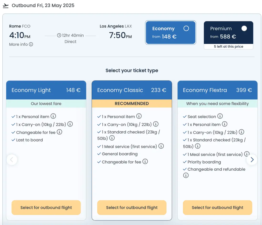 Low-cost airline Norse Atlantic Airways debuts its new route from Rome to Los Angeles next year. Currently, one-way tickets to California are available for as little as €148 with a cabin bag and €218 with 20kg of hold luggage. Round-trips aren’t nearly as attractive, as these tickets price out at €541 – without any extras.