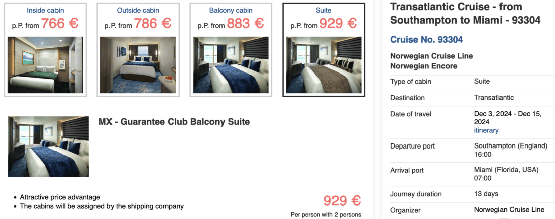 In early December 2024, the Norwegian Encore, operated by the American Norwegian Cruise Line, will be transferred from Southampton to Miami. Currently, you can book this transatlantic crossing at particularly favourable prices. For 12 nights in a “suite” (basically a glorified slightly larger balcony cabin with no extra benefits), you’ll pay only €929 per person. Normal balcony cabins are available for €883 per person. A highlight, however, is that there is almost no surcharge for solo travellers (except for these “suites”). Each passenger can have an inside/outside/balcony cabin for himself at nearly the same price, e.g. a balcony cabin for only €896.