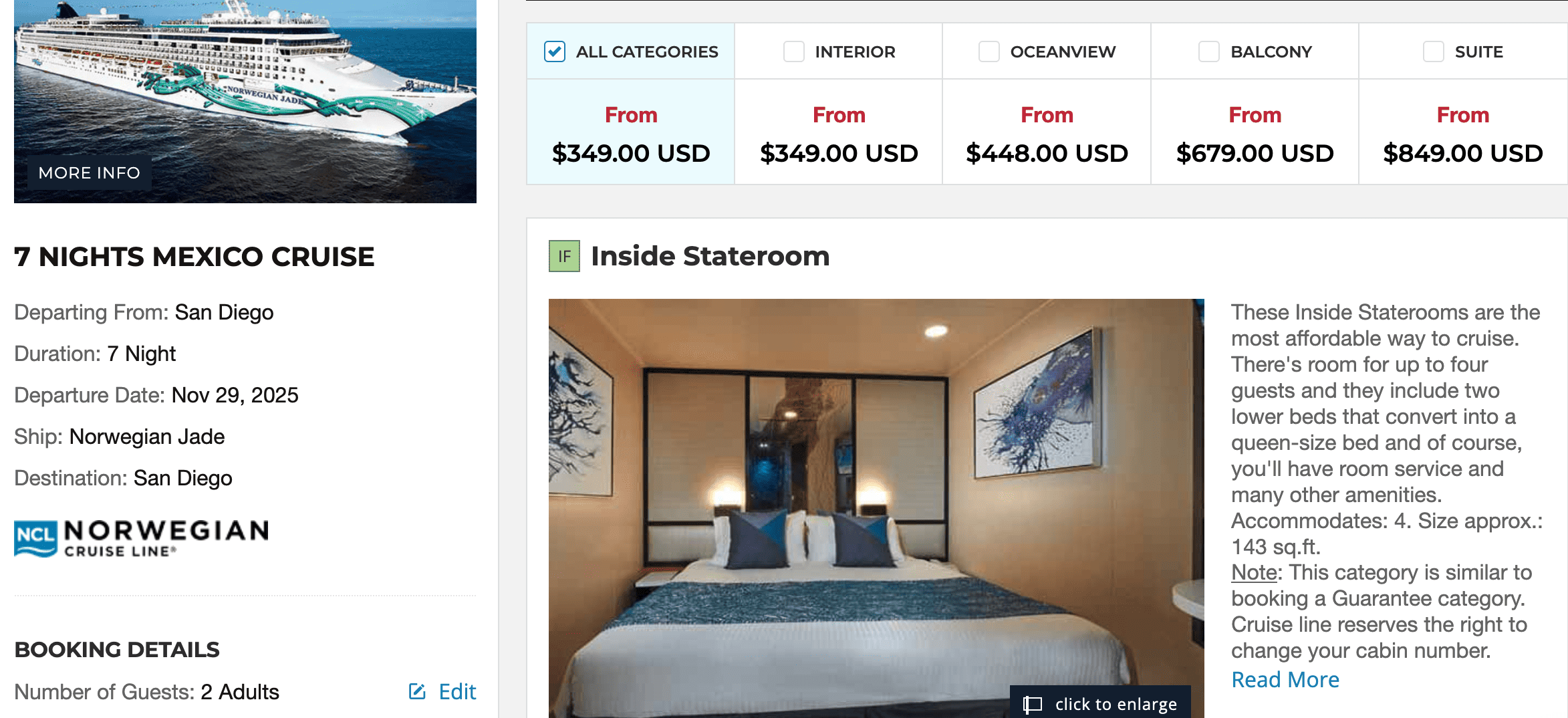You can currently book an affordable cruise along the Mexican Riviera on the Norwegian Jade. The one-week trip, starting and ending in San Diego with departure at the end of November 2025, is available in an inside cabin from €299 (~US$350) per person. At only €42 per night, including all meals, that’s cheaper than hotels in Mexico!