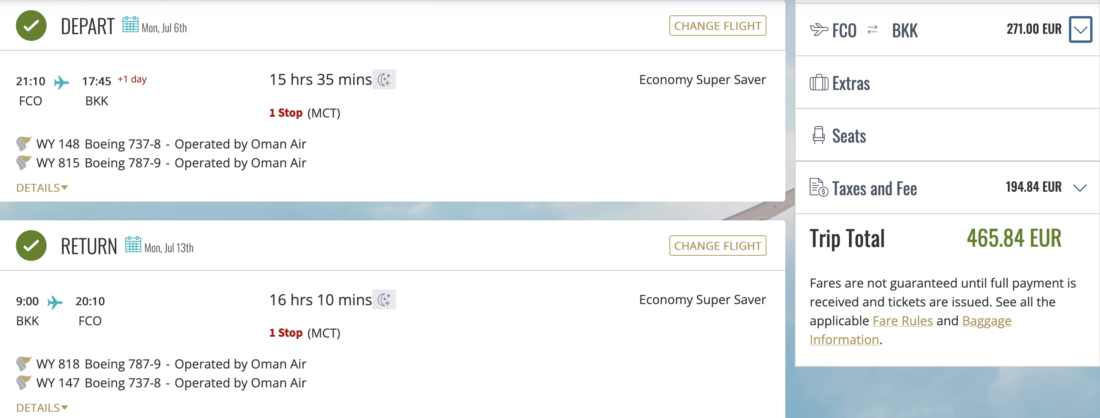 Oman Air is offering a deal from Rome to Bangkok, starting at just €466. This deal doesn’t include checked luggage, but the cheapest fare including a 20kg checked bag is just €33 more expensive. There are plenty of available dates throughout the entire year.