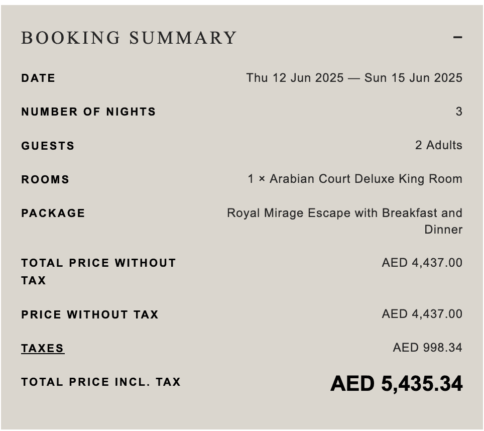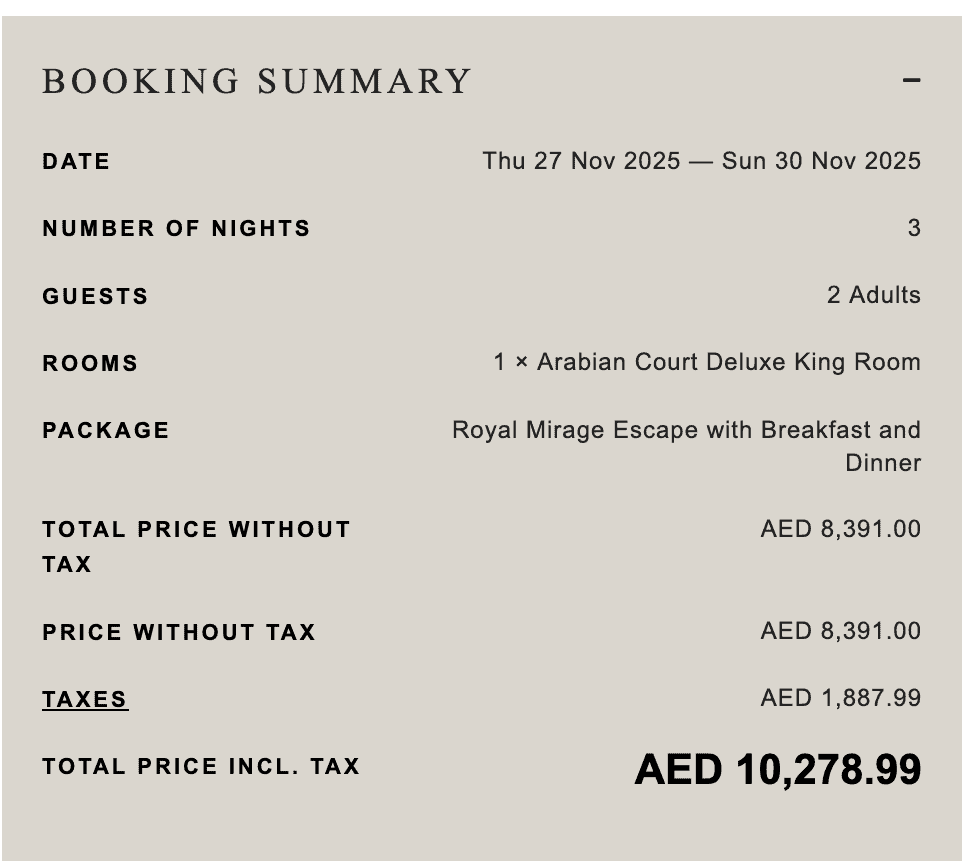 If we compare Luxury Escapes‘ prices with what you’d pay directly at the hotel in the summer, you have a price of €313 per night at Luxury Escapes vs. a price tag of €472 per night at the hotel for the Arabian Court Deluxe room with breakfast and dinner. In other words, you’d be saving roughly 33% by booking through Luxury Escapes. The savings, however, are even higher later in the year. In late November, the same thing costs €891 directly at the hotel, while Luxury Escapes’ price stays exactly the same. So if you stay late in the year, you’ll save roughly 65% by booking through Luxury Escapes!