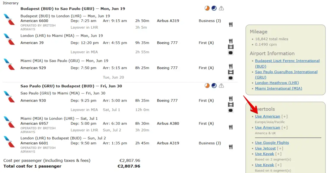 Thanks to the power tools, you can then book the flights directly on American Airlines’ website with just one click: