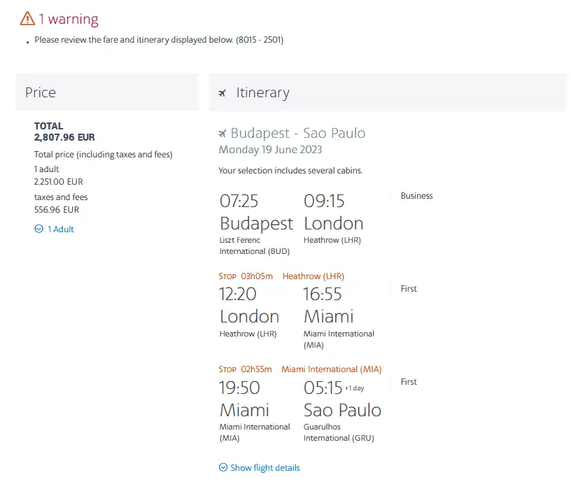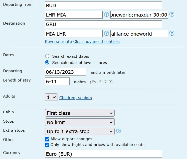 Theoretically, the fare can also be found via Google Flights, but then connections with the USA – São Paulo segment are usually displayed in business class. Not a good idea when the first class is available at almost the same price. We, therefore, recommend using the ITA Matrix (instructions).
