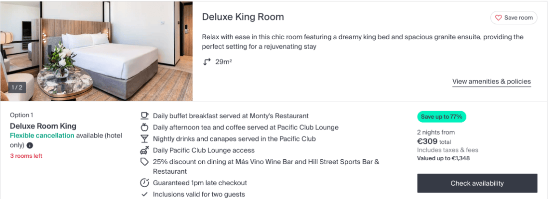 Thanks to LuxuryEscapes, you can currently book a Deluxe King room at the newly renovated Pan Pacific in Perth, including lounge access, for only €155. That’s almost €100 cheaper – per night – than what you’d pay directly on the hotel’s website for a rate with lounge access. The mere condition is that you stay for at least 2 nights. This rate is available from now until February 2025.