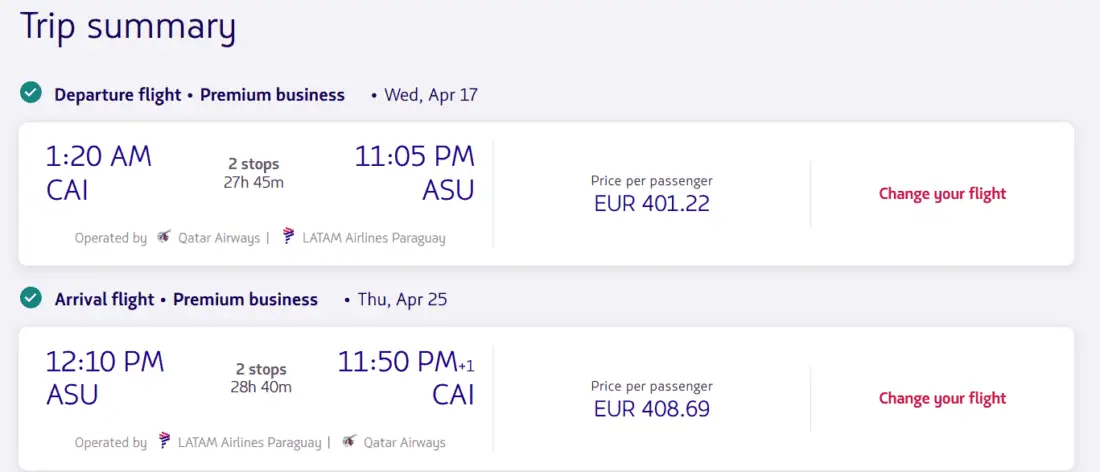 An exciting opportunity is the chance to travel to South America with Qatar Airways. A roundtrip flight from Cairo to Paraguay or Uruguay is available starting at €810. Tickets can be booked directly through LATAM (as codeshare) and paid in euros.