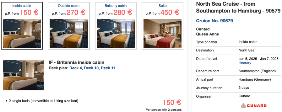 If you’re planning on booking an outside or balcony cabin, departing 3 days earlier on the Queen Victoria is the cheaper choice, as prices for those cabin types are even cheaper there: Queen Victoria: 2 Nights in a Balcony Cabin from Southampton to Hamburg for €250 pp in January, incl. Tips