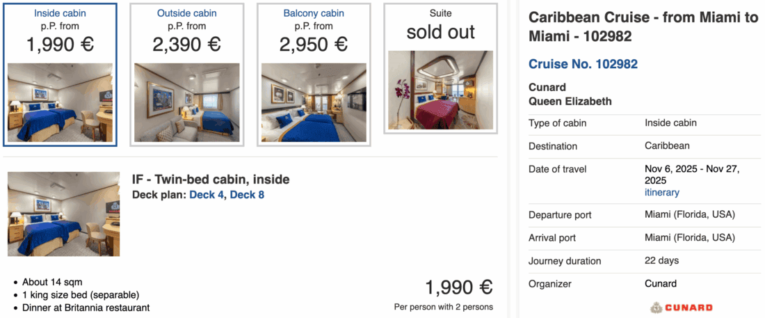 The Queen Elizabeth, a ship from the traditional Cunard line, will embark on a few three-week Caribbean cruises between October 2025 and January 2026. This itinerary includes numerous dream islands, a combination rarely offered since most cruises in the region last a maximum of 14 nights. For 21 nights in an inside cabin departing from and returning to Miami, prices currently start at €1,990 per person. If you prefer a more luxurious experience, outside cabins start at €2,390, and balcony cabins start at €2,950 per person (based on double occupancy).