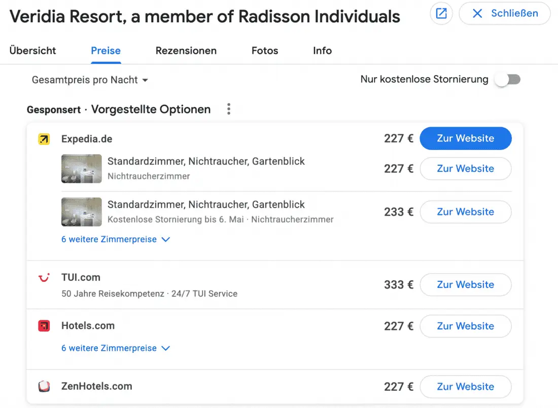 A comparison on Google Hotels with external booking platforms like Expedia or Booking.com shows prices starting at €227 per night for the same period, which corresponds to savings of 32% — quite close to the advertised 35%.