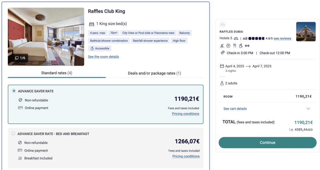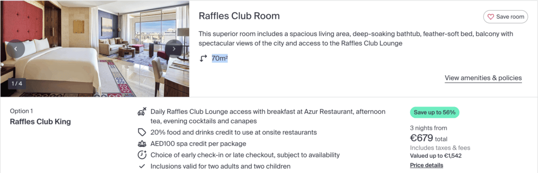 Unlike many other hotels in Dubai, the Raffles does not significantly lower its prices in the summer. This price is available from March through September. The first months of that travel period should be the most attractive (due to the somewhat lower temperatures). In early April, the Raffles charges roughly €395 per night for its cheapest Club Room rate. That’s over 75% more than what Luxury Escapes is charging. Actually, one should compare LuxuryEscapes’ price with the Bed And Breakfast rate, which is even more expensive, as LuxuryEscapes’ rate includes the full breakfast in the restaurant and not only the smaller Lounge breakfast. Long story short: the savings are big!