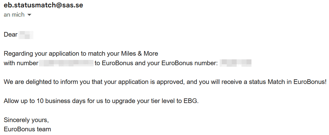 „Betreff: RE: SAS Eurobonus Gold Status Request EB # xxxxxxxxxxxxxxxxxx