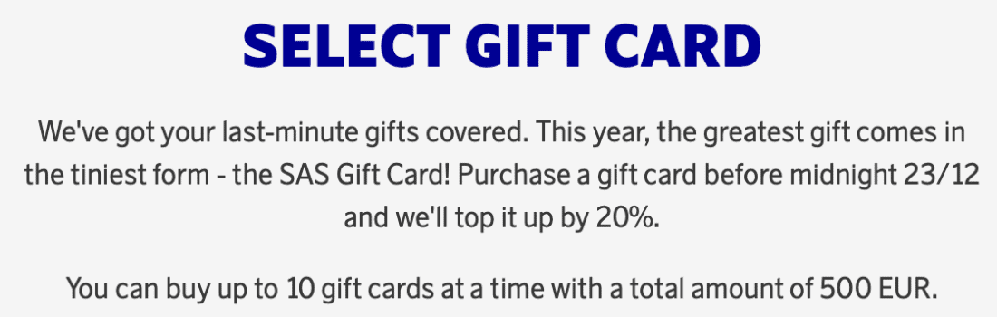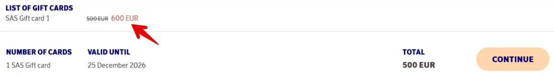 Currently, SAS is offering a generous 20% bonus on gift card purchases. For instance, you can buy a €600 voucher for just €500, which corresponds to a 16.7% discount.