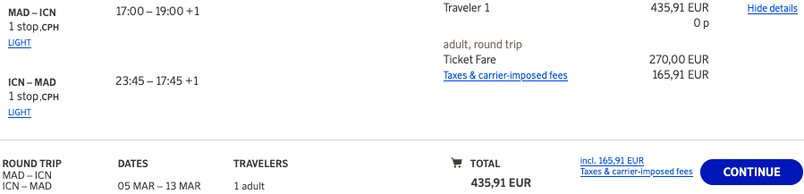 SkyTeam member SAS is selling cheap tickets to Seoul, starting at only €436. Unlike most of their sales, this one is available from multiple non-Scandinavian countries: Spain, Hungary, Italy, and the Netherlands. Luggage is not included, but the surcharge of €90 is relatively fair. SkyTeam frequent flyers get the luggage for free.