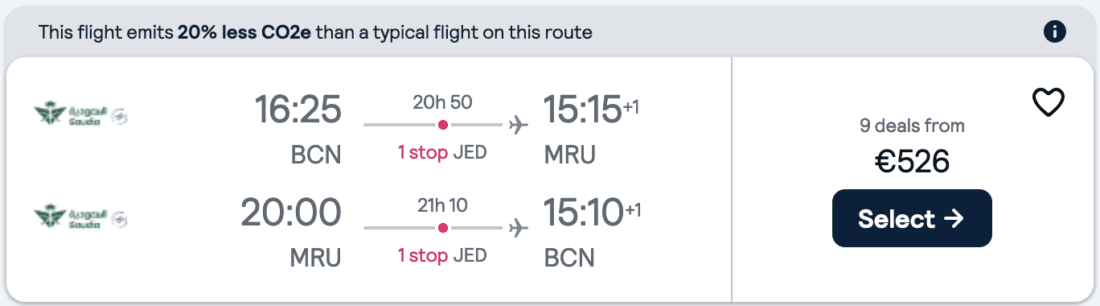 SkyTeam member Saudia is offering a deal from Barcelona, Madrid, and Rome to Mauritius starting at just €526. This deal includes 23kg of checked luggage. Departures are available from February 2025 onwards, with very limited availability during the summer. The major downside of this deal is that you’ll have long 8-hour layovers in Jeddah in both directions.