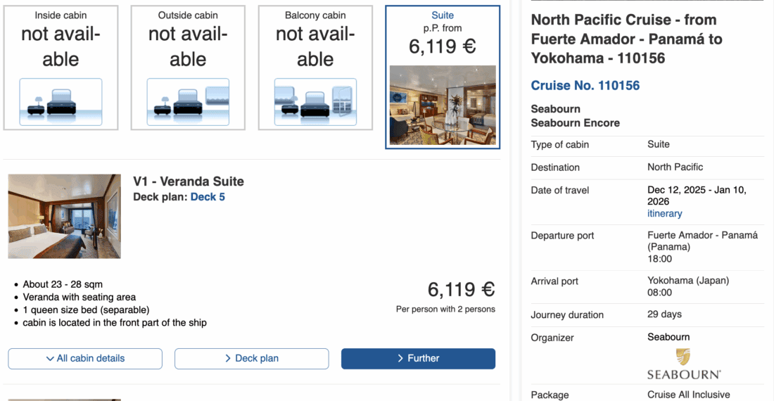 At Travel-Dealz, you’ll regularly find cruises from operators like MSC and Costa, but also luxury cruises on smaller ships with an all-inclusive concept. Today, we have an interesting offer for you with the Seabourn Encore. This luxury ship sails in December 2025, covering Christmas and New Year, from Fuerte Amador in Panama to Yokohama in Japan, with stops in e.g. Hawaii. The cheapest suite on this 28-night journey is currently available from €6,199 per person.