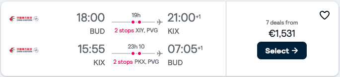 Sadly, flying with only one stop is not possible (at this price). You’ll always have a flight between Budapest and China, a Chinese domestic flight, and a flight between China and Osaka. The Chinese cities vary by date. But at least all segments are business-class.