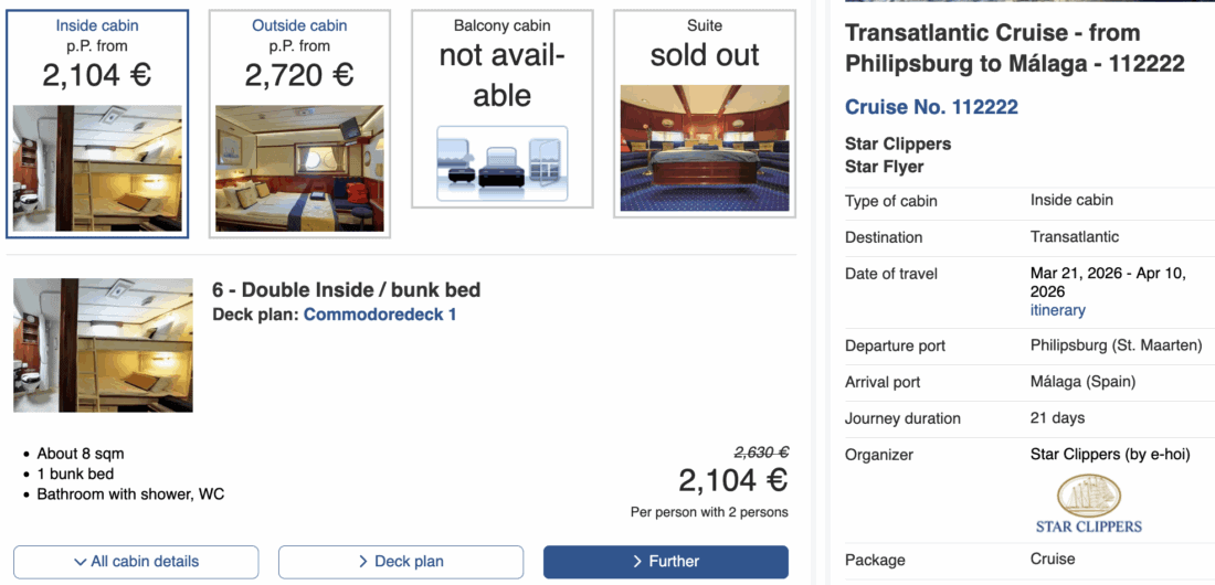 Have you always dreamed of crossing the Atlantic on a tall ship? If so, this offer might be perfect for you: The Star Flyer sets sail at the end of March 2026 on a 20-night voyage (18 of which are at sea) from Philipsburg, St. Maarten, to Malaga. Prices for an inside cabin start at €2,104 per person. The lowest-priced outside cabin is available for €2,720 per person.