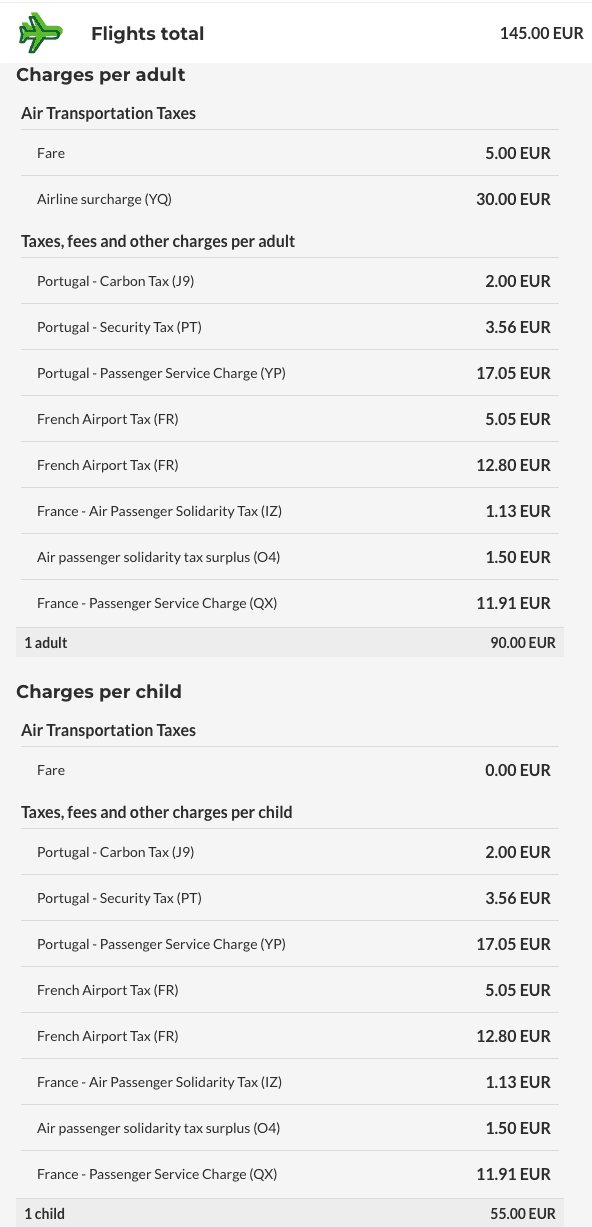 As you can see, the family of three can fly to Paris and back for only €145, the adult paying the full €90, the child only paying €55 in taxes, and the infant flying completely free.