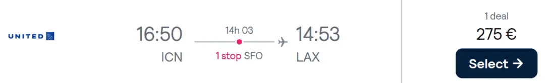 Star Alliance member United Airlines is currently offering one-way tickets across the Pacific starting at €275 (~US$323). The cheapest combination is a flight from Seoul to Los Angeles. One checked bag up to 23 kg is included. However, this is a Basic Economy fare, so seat selection is not included, even for status customers. Departures are available between September and December.