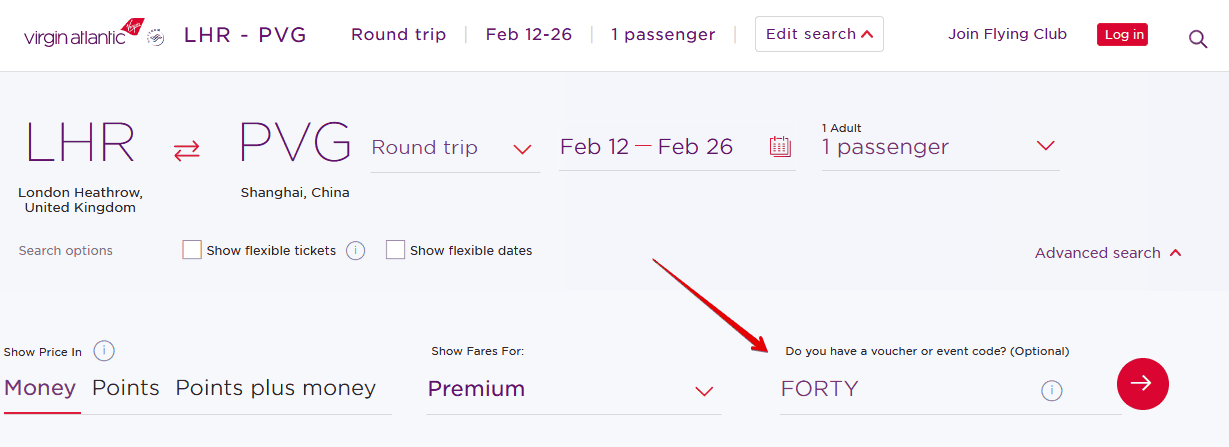 You have to book directly on Virgin Atlantic’s website to apply the code. To do so, you must select the advance search option on the homepage.