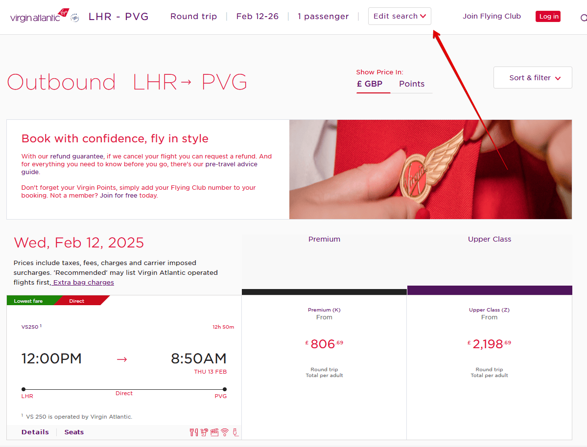 You can use our Mileage Calculator to see how much you’d earn. Since Virgin Atlantic displays booking classes and prices transparently on its website, it’s rather easy to find out: