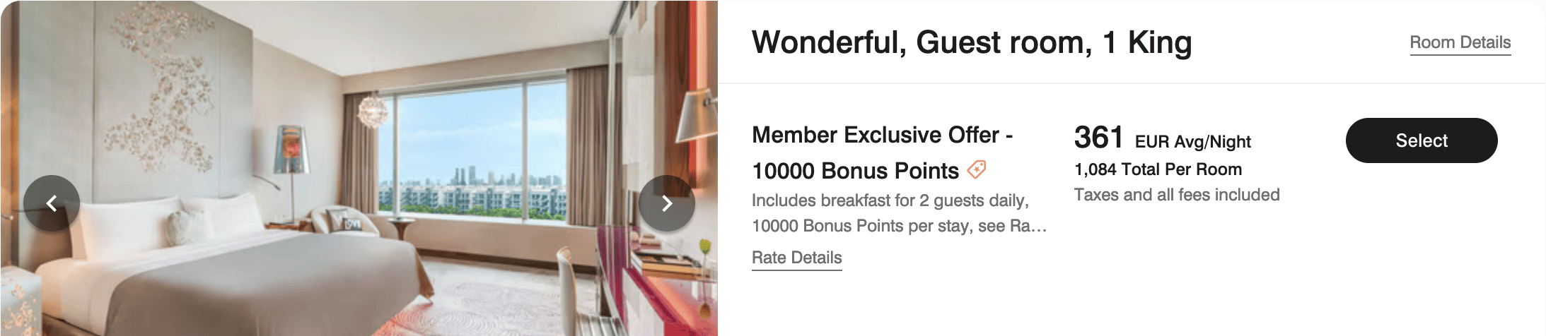 While ASMALLWORLD charges €225 per night, Marriott’s website charges €361 for the rate that includes breakfast. So, at ASMALLWORLD you’re saving almost 40%. Add to that, that you’ll get US$100 (~€85) to spend during your stay and possibly an upgrade, and this turns into an amazing deal!