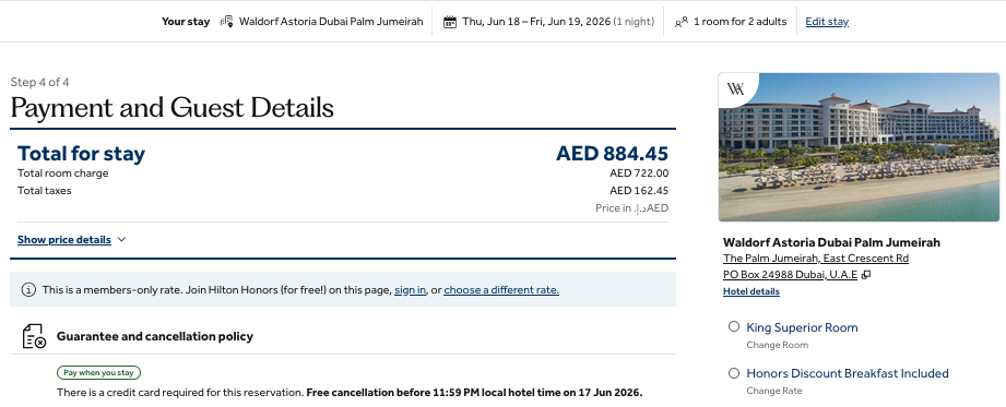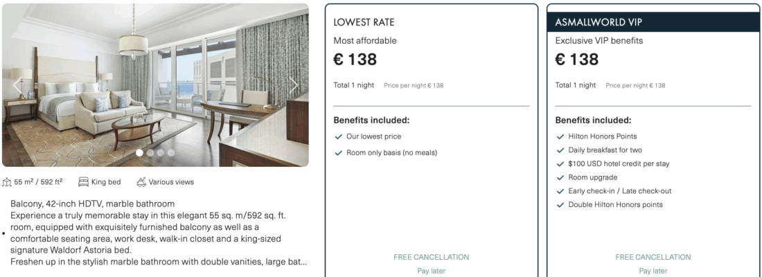 Even during the hot summer, Hilton never charges less than AED 885 (~€208) for a flexible stay with breakfast at this hotel. In other words, booking through ASMALLWORLD saves you over 30%, plus it gets you the upgrade, the double points, and US$100 (~€86) to spend at the hotel. That makes it a fantastic deal.