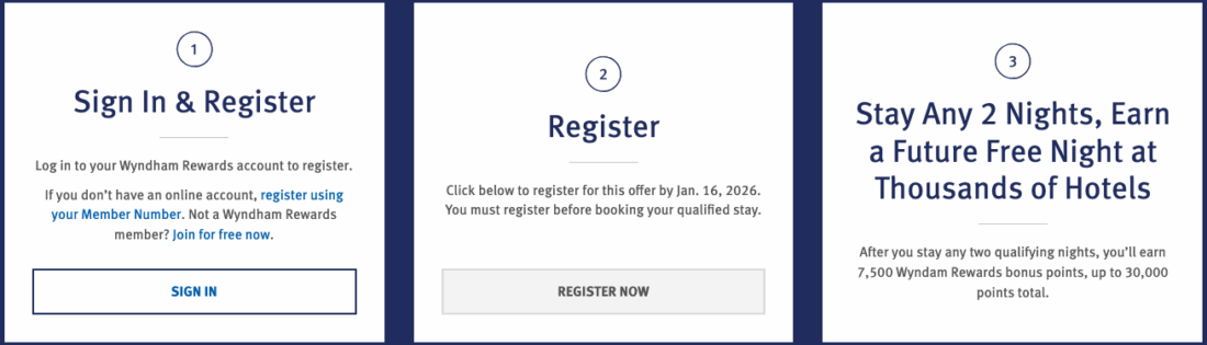 Wyndham is one of the largest hotel chains worldwide, and is especially present in every small town on the American continent. Currently, their loyalty program Wyndham Rewards offers an interesting promotion: For every two nights booked and completed after your registration, you will be rewarded with 7,500 bonus points (which is enough for a free night at over 1,800 hotels!). The two nights don’t even need to be consecutive. You can use this promo for up to 8 nights, thus receiving up to 30,000 points. The nights must take place before January 20, 2026, and not be in China (including Macao, Taiwan, and Hong Kong)