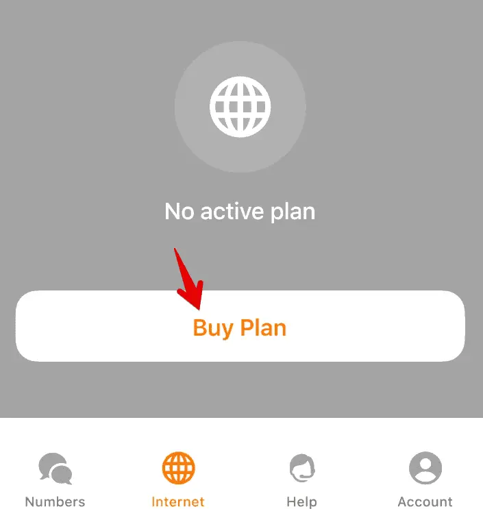 After setting up your account, you need to activate the pay-as-you-go option. Open your app and select Internet from the index at the bottom. Then, click Buy Plan