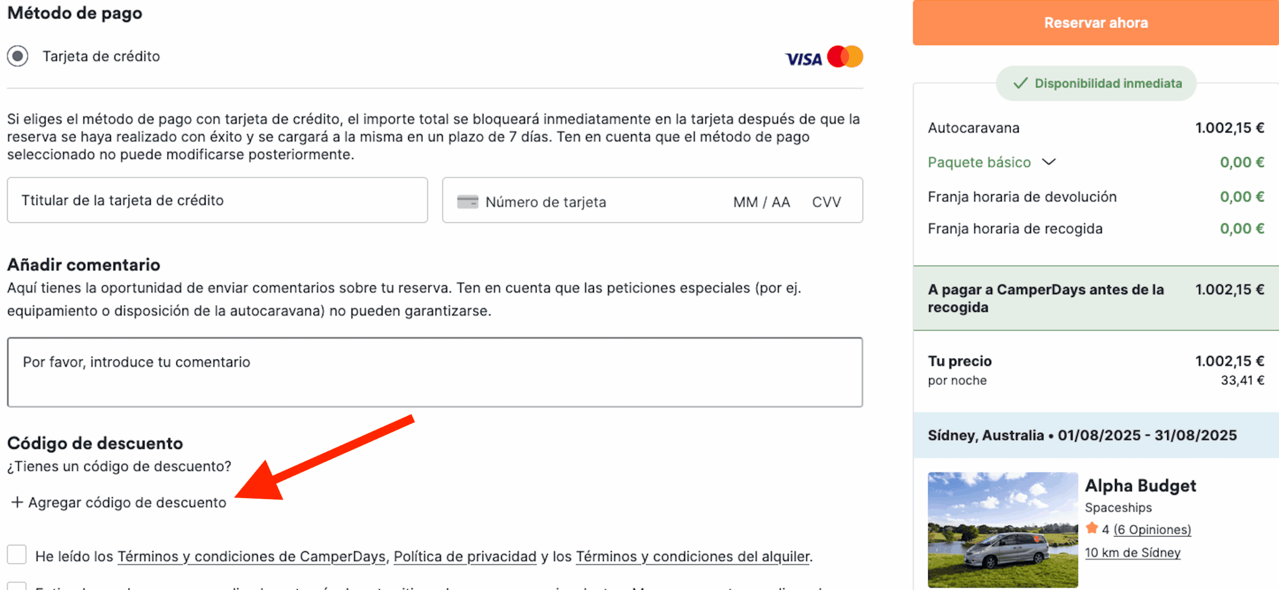 Para canjear su código de descuento de CamperDays, seleccione el vehículo deseado y complete sus datos personales. Durante la etapa de pago, podrá ingresar su código de descuento en el paso correspondiente al ingreso de los datos de pago. A continuación, se muestra un ejemplo de un alquiler de una autocaravana Alpha Budget durante todo el mes de agosto de 2025 en Sídney: