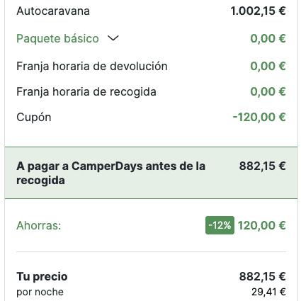 CamperDays es uno de los mejores motores de búsqueda especializados en alquileres de vehículos recreativos, comparando ofertas de empresas de todo el mundo. Actualmente, la empresa ofrece un descuento de €100 con un gasto mínimo de €999.