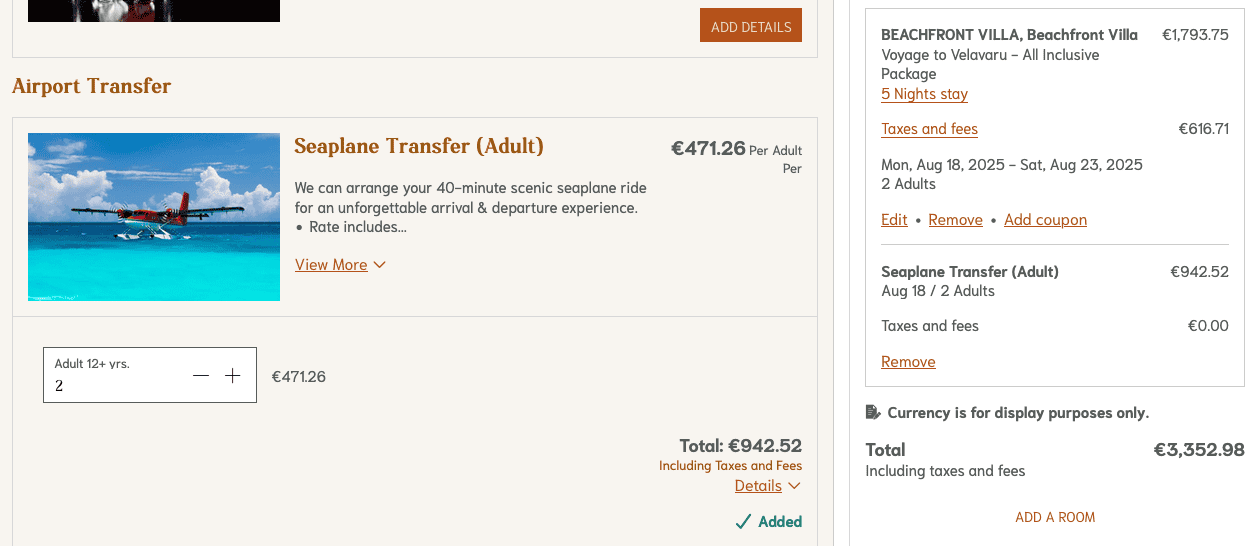 Mientras que LuxuryEscapes cobra 2.519 euros por 5 noches con traslados y todo incluido, el hotel cobra un precio muy superior. En agosto, por ejemplo, las cinco noches le costarían 3.353 euros. Los carísimos traslados influyen mucho en esa diferencia de precio, ya que cuestan casi 950 euros para 2 adultos. Si además utiliza el cupón del 10% de LuxuryEscapes, estará ahorrando aproximadamente un 32% reservando a través de LuxuryEscapes.