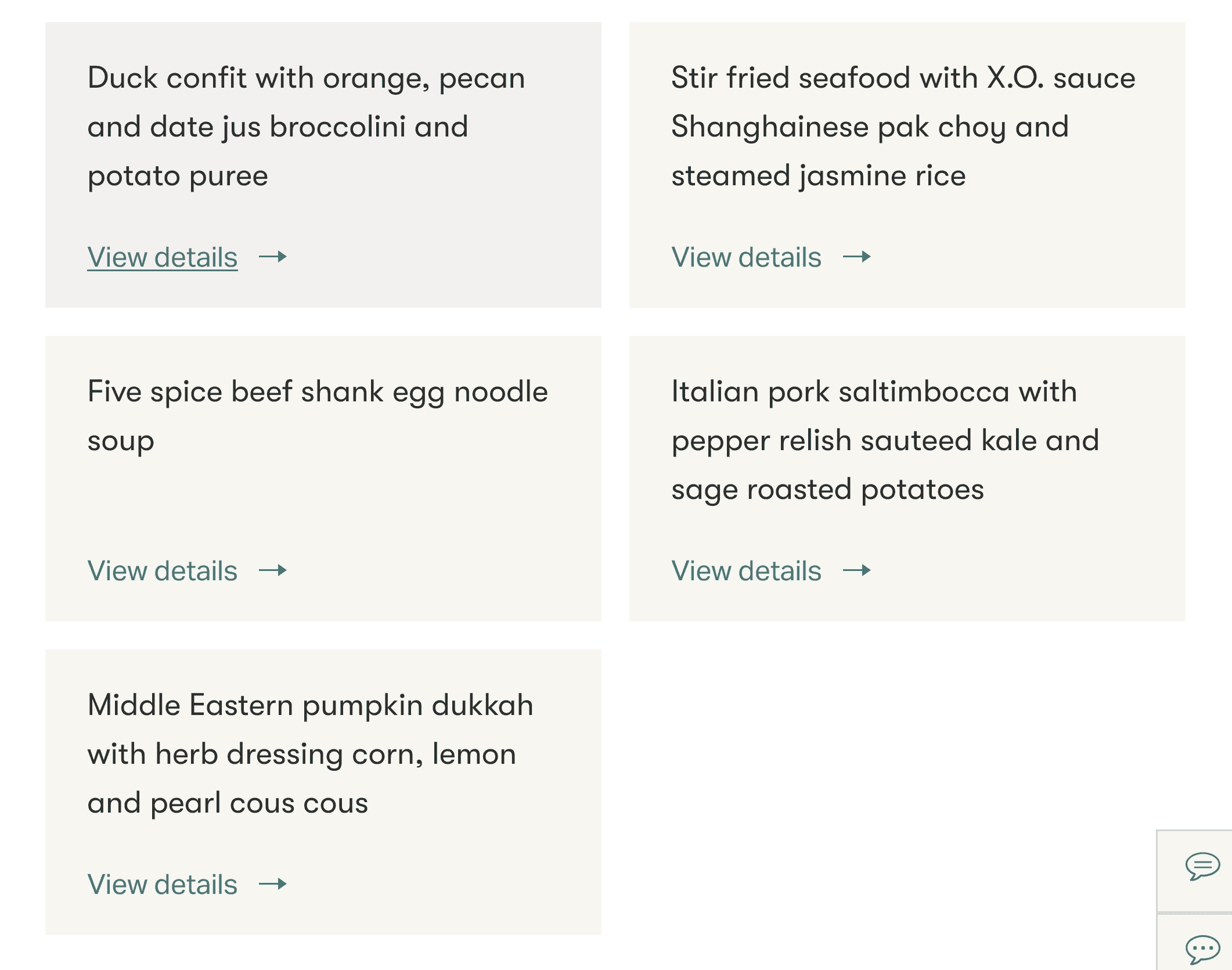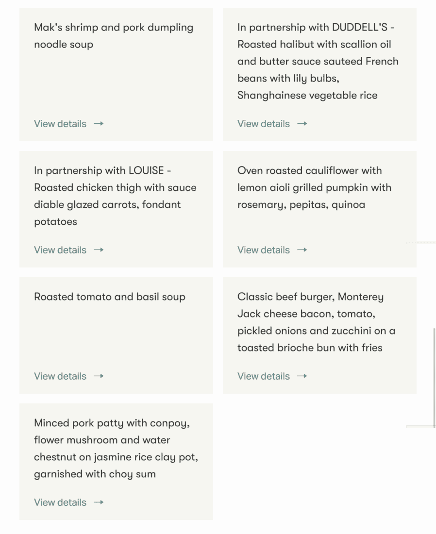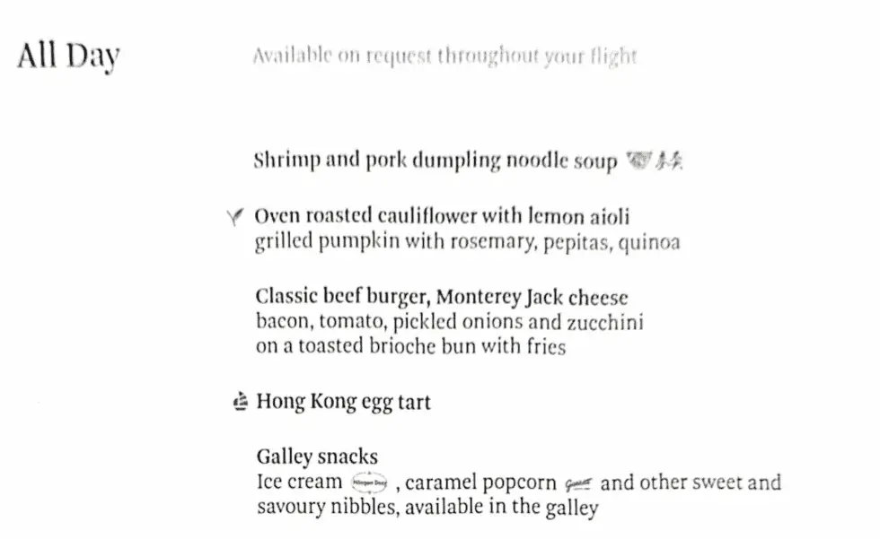 Shortly afterward, meal and drink orders were taken. I had already made up my mind in advance, since Cathay allows digital pre-ordering of your preferred meal on both flight segments. The selection departing Hong Kong was noticeably larger than departing Sydney. Below are the respective menus: