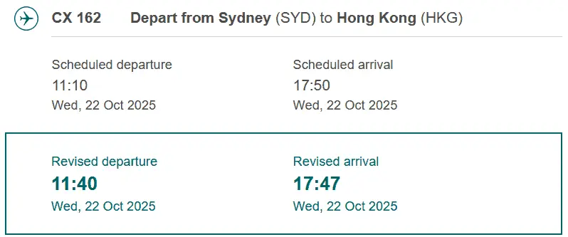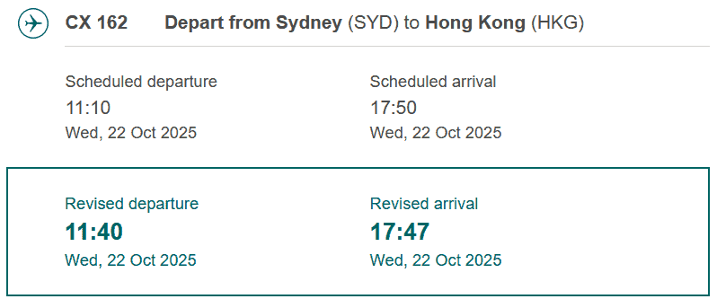 • Flight 1: CX 162 Sydney SYD – Hong Kong HKG