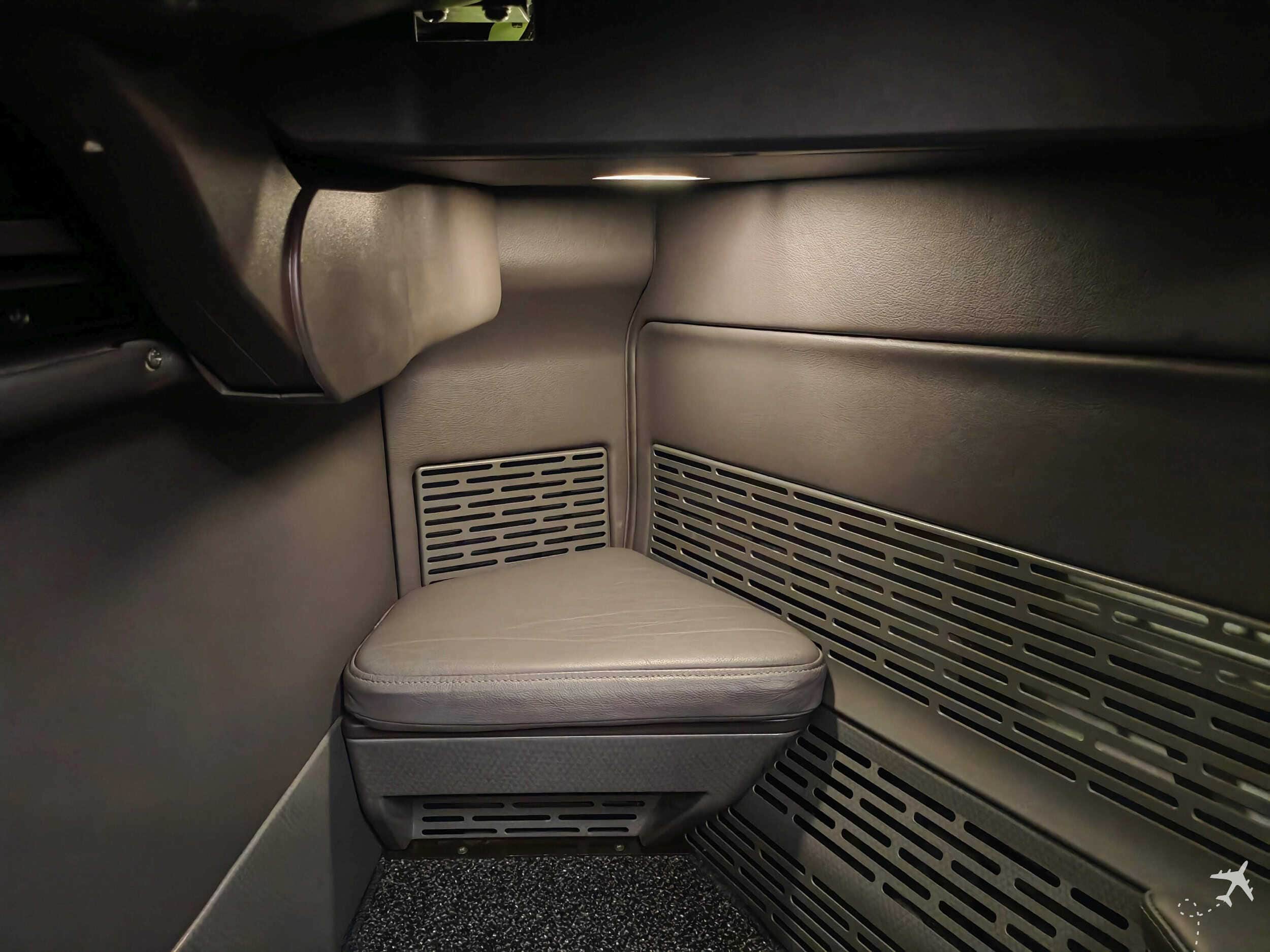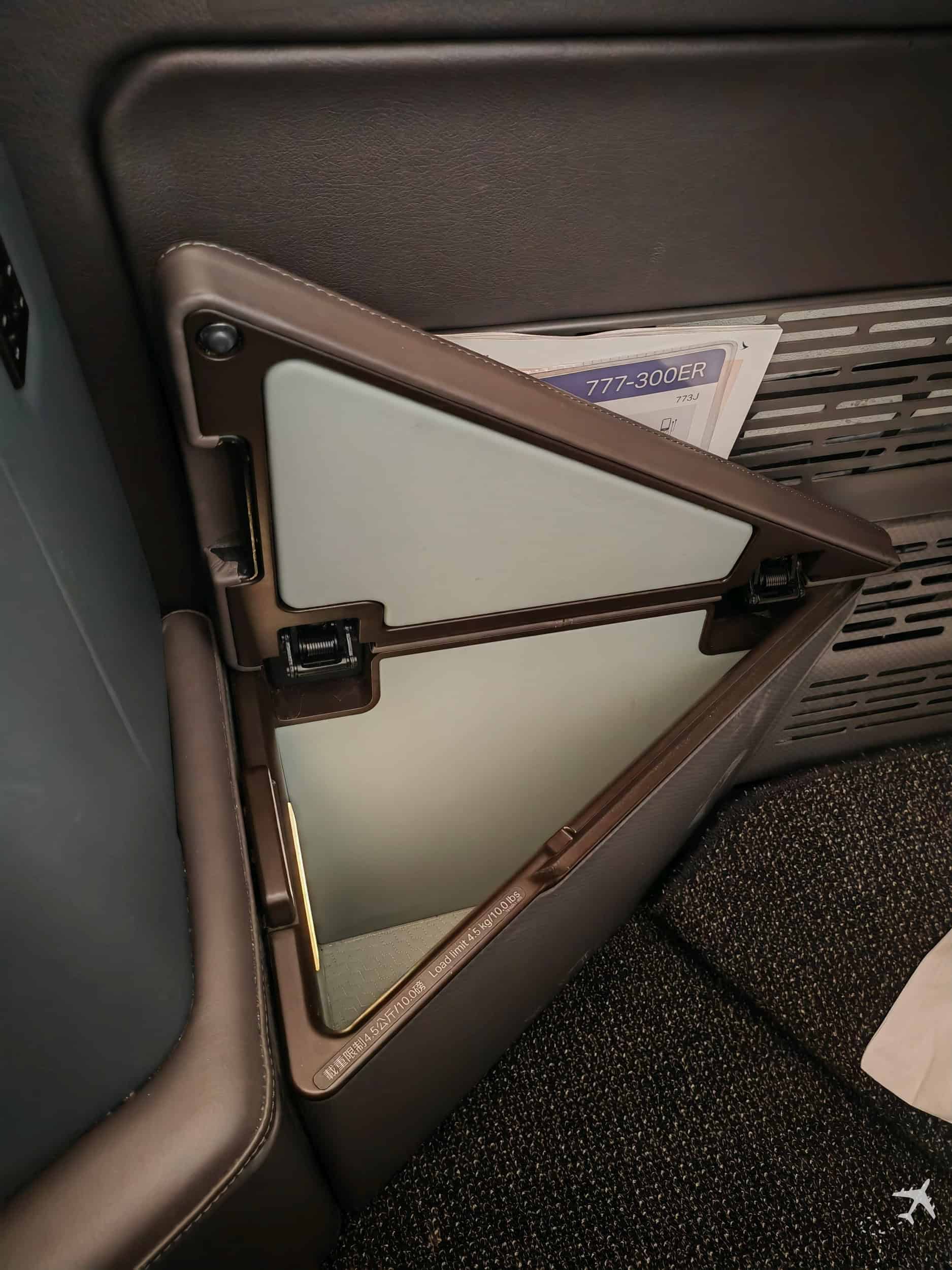 Looking left, there’s a large sliding shelf that reveals a small storage compartment for items like a phone. Sounds practical, but isn’t very convincing. On my first flight, the mechanism was already broken and wouldn’t close fully, even though there was a clear “Close immediately when not in use” label. On the second flight, it did close, but the button required a lot of force to press. Apparently that’s normal.