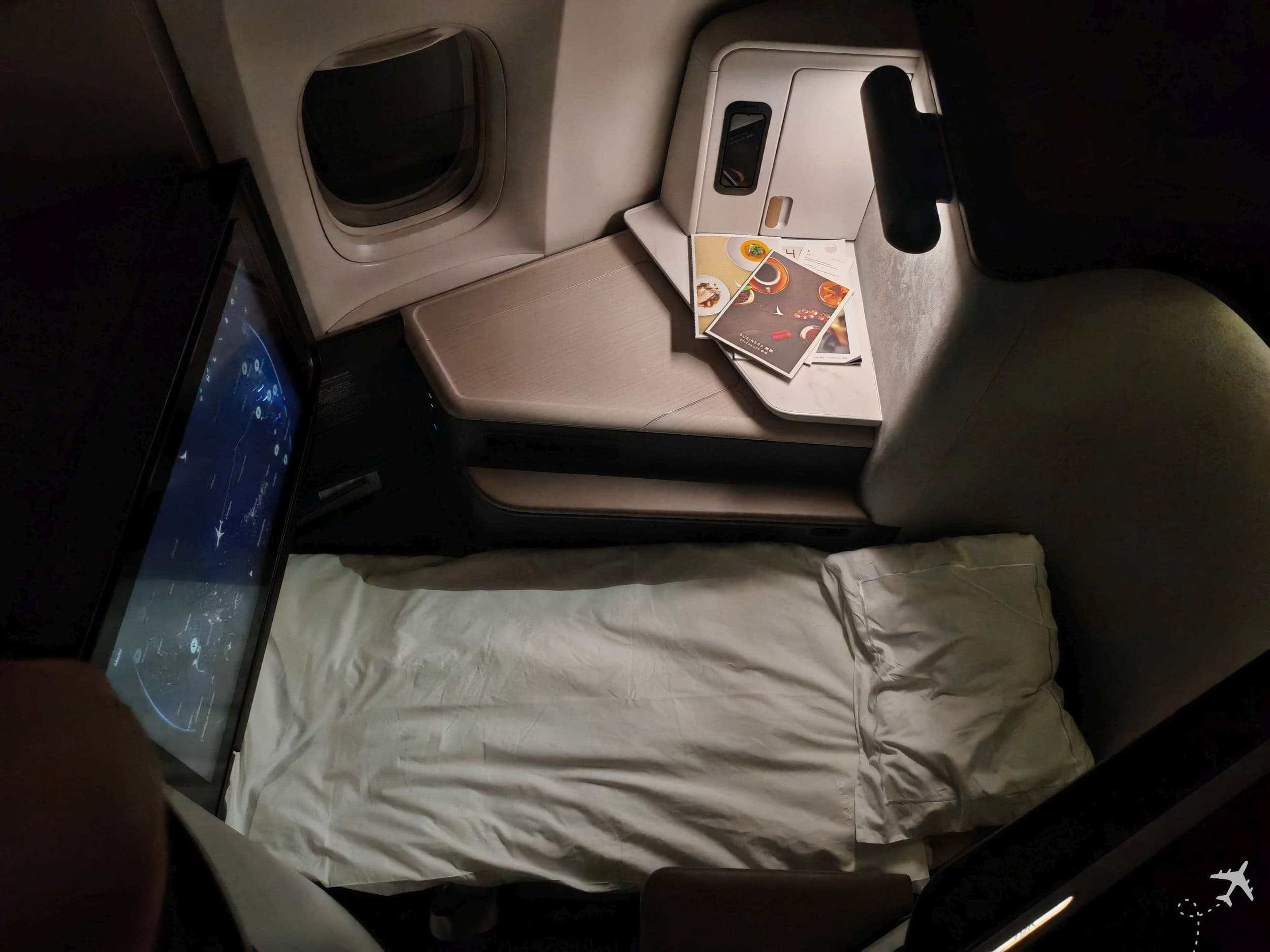 The headrest is not adjustable, but I actually prefer it this way. Every seat manufacturer has to make compromises: either the headrest is fixed to create a flat bed, or it’s adjustable but can be uncomfortable when lying down, like on Iberia. I prefer Cathay’s solution and use a pillow if needed. Though a second, smaller pillow would help.
