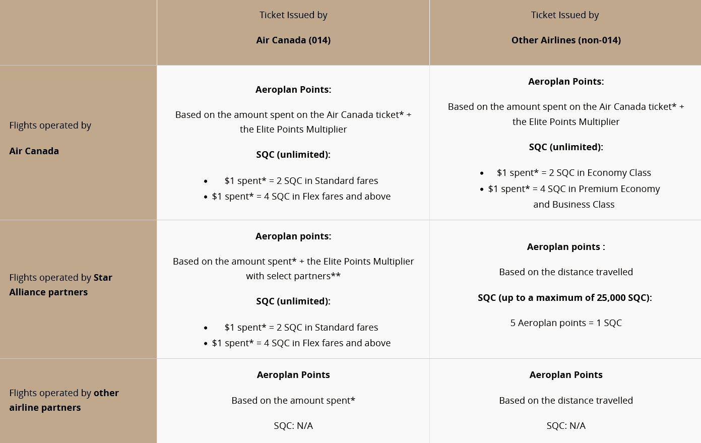 • Air Canada Economy Standard & higher: 2 SQC per CA$