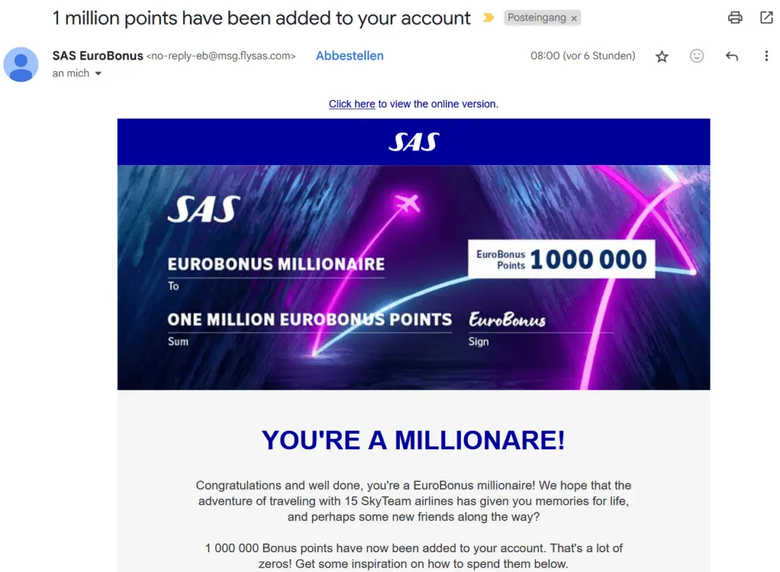 If you haven’t received the notification of your win yet, there’s no reason to despair. SAS has set the deadline for the application for a subsequent credit to be the end of February 2025. The million points will then be awarded accordingly later.