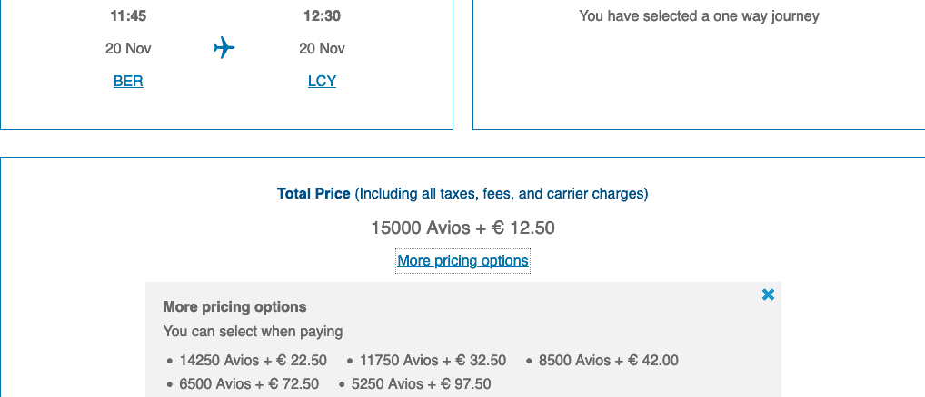 Anyone booking an award flight now will find that all options have become €12 more expensive. Option 1 no longer costs 15,000 Avios + €0.50, but 15,000 Avios + €12.50. The best option has increased from 8,500 Avios + €30 to 8,500 Avios + €42: