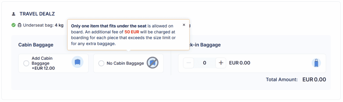AJet threatens passengers who do not add the carry-on baggage in advance with a €50 penalty fee at the gate.