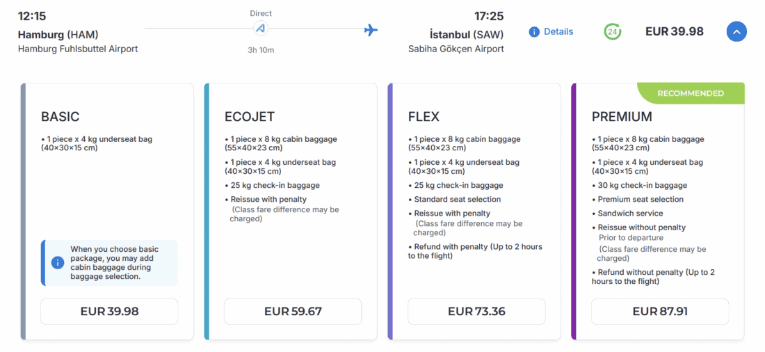 At least the surcharge is still fairly reasonable in most cases. As in the following example, where the fare including 25 kg of checked baggage and a large carry-on costs only €20 extra.