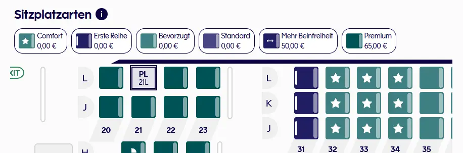 Finnair does not sell premium economy tickets within Europe. However, these seats can be selected with an economy ticket for an additional fee. As a Finnair Gold member, I can select Economy Comfort seats (extra legroom in rows 31–34) for free, but premium economy seats come with a hefty €65 surcharge per direction.
