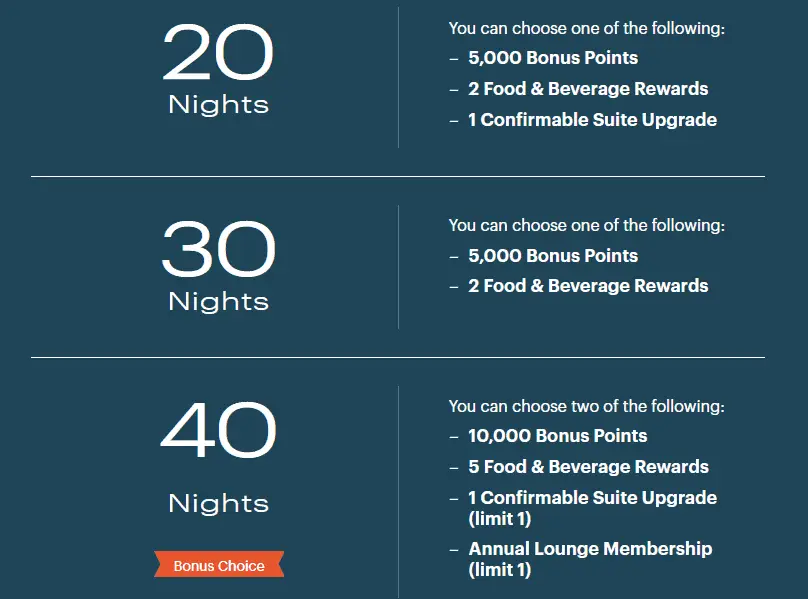 Already from 20 nights, you get a confirmed suite upgrade for up to 5 nights in a row. Alternatively, there are 2 meal vouchers worth €20 each or 5,000 points. Every 10 nights (up to 100) there is another benefit.