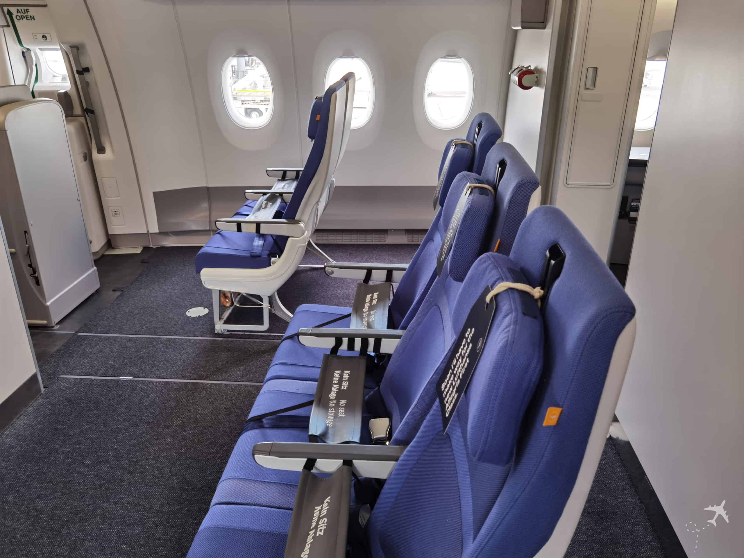 Because only a single plane is equipped with the Allegris first class cabin and equipment changes are not uncommon, it’s very risky to purchase a business class ticket and gamble on an upgrade. The Airbus A350 hosts a single row of four first class seats. These are equipped with sliding doors and absurdly large monitors, among other flashy amenities. The middle seats can be converted into a joined suite, designed for couples travelling together. It can also be occupied by a single passenger. You can find photos from a 2023 exhibition here.