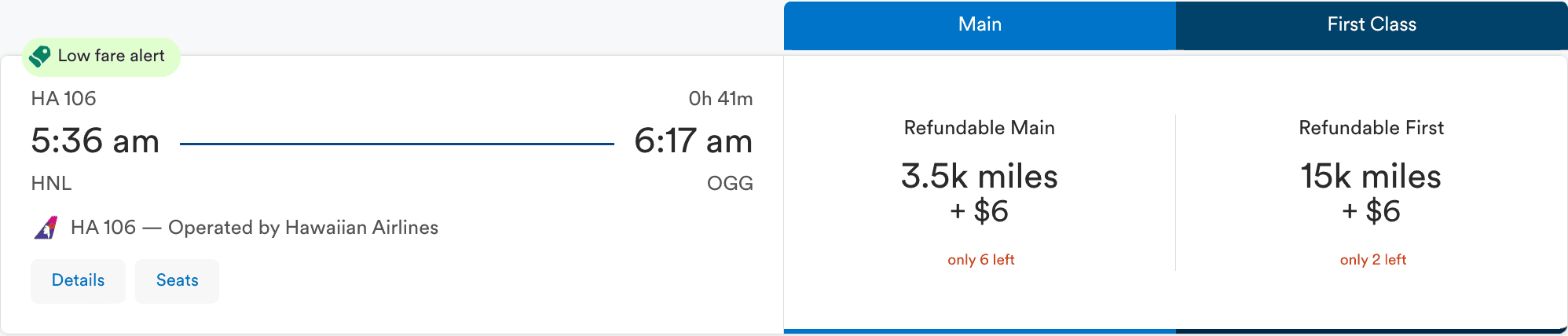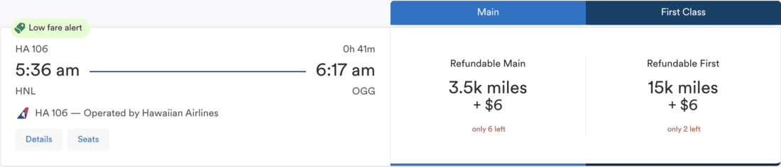 The price even includes luggage. As you can see in the screenshot, you also have the option of paying 15,000 miles + US$6 (~€5) to fly in first class. But who needs first class on a 40-minute flight?
