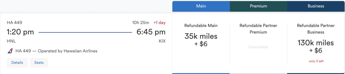 Business Class from Hawaii to Japan for 130,000 miles + $6 o/w