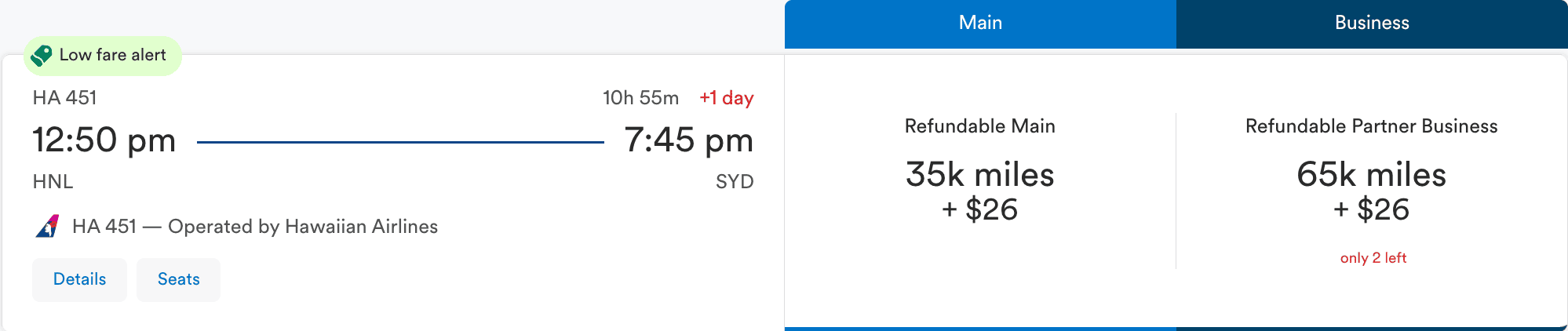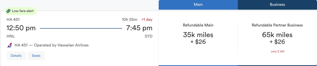 Business Class from Hawaii to Sydney for 65,000 miles + $26 o/w