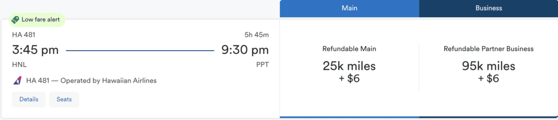 These are not as attractive as the previously mentioned routes, as the flights are neither particularly long nor the prices particularly low. But it’s still worth mentioning, that Hawaiian flies to Tahiti, Rarotonga, and Pago Pago, and that prices for those non-stop flights start at 25,000 miles in economy class and 95,000 miles in business class.