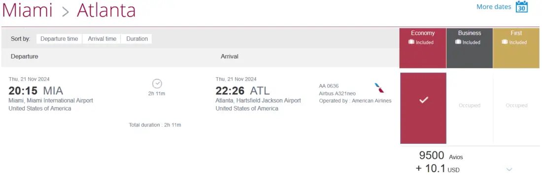 An alternative would be booking through Finnair Plus. According to the award chart, it costs 11,000 miles to fly in economy class and 30,000 for domestic first class within the USA—and this can include a connecting flight if desired. However, it often happens that connecting flights are charged separately when booking (via phone/WhatsApp).