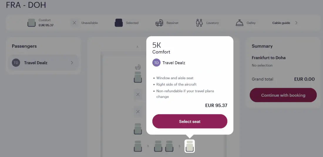But in the next step, charges are applied as soon as you select a seat. For example, on Frankfurt – Doha, each seat costs €95.37: